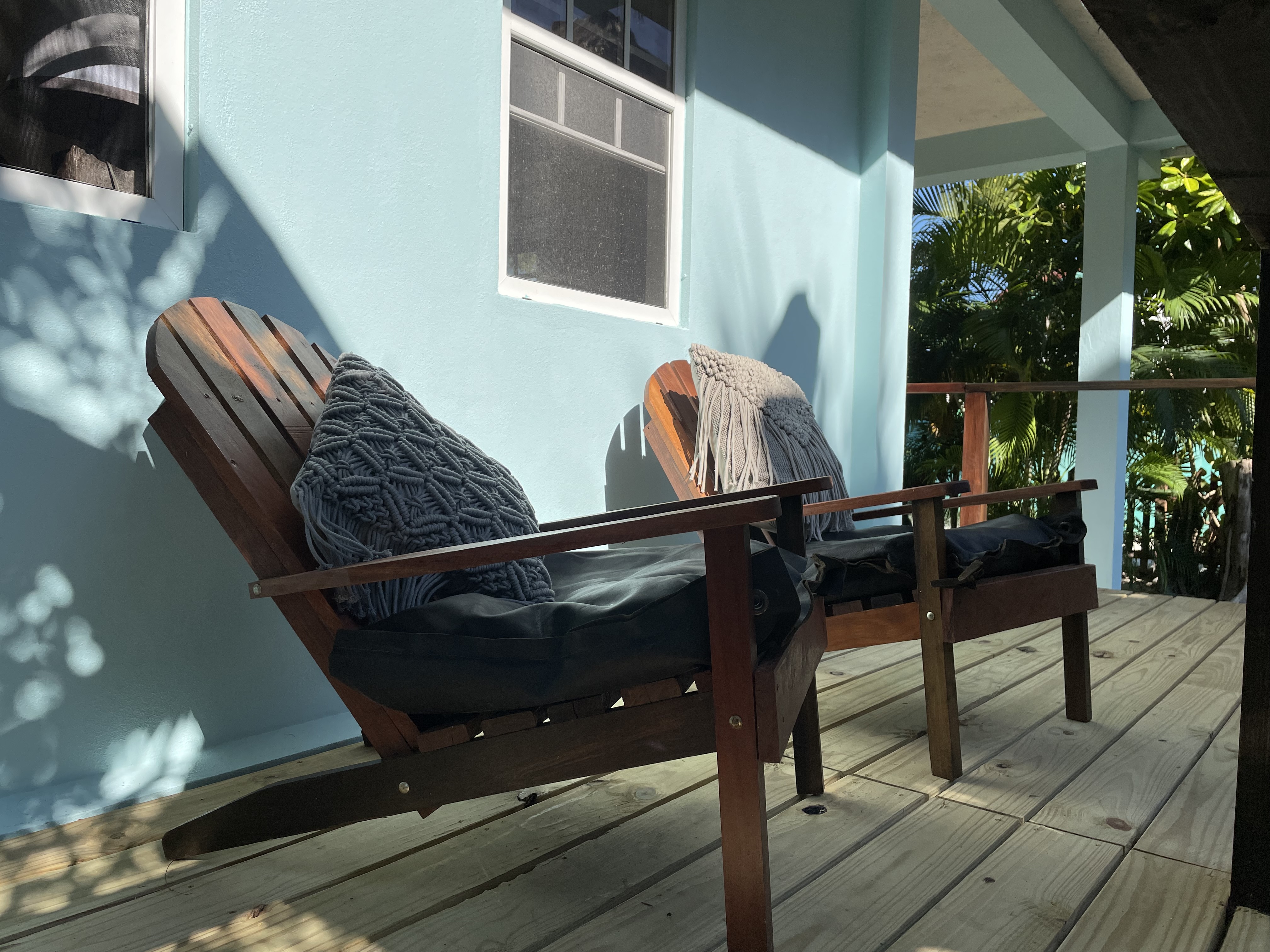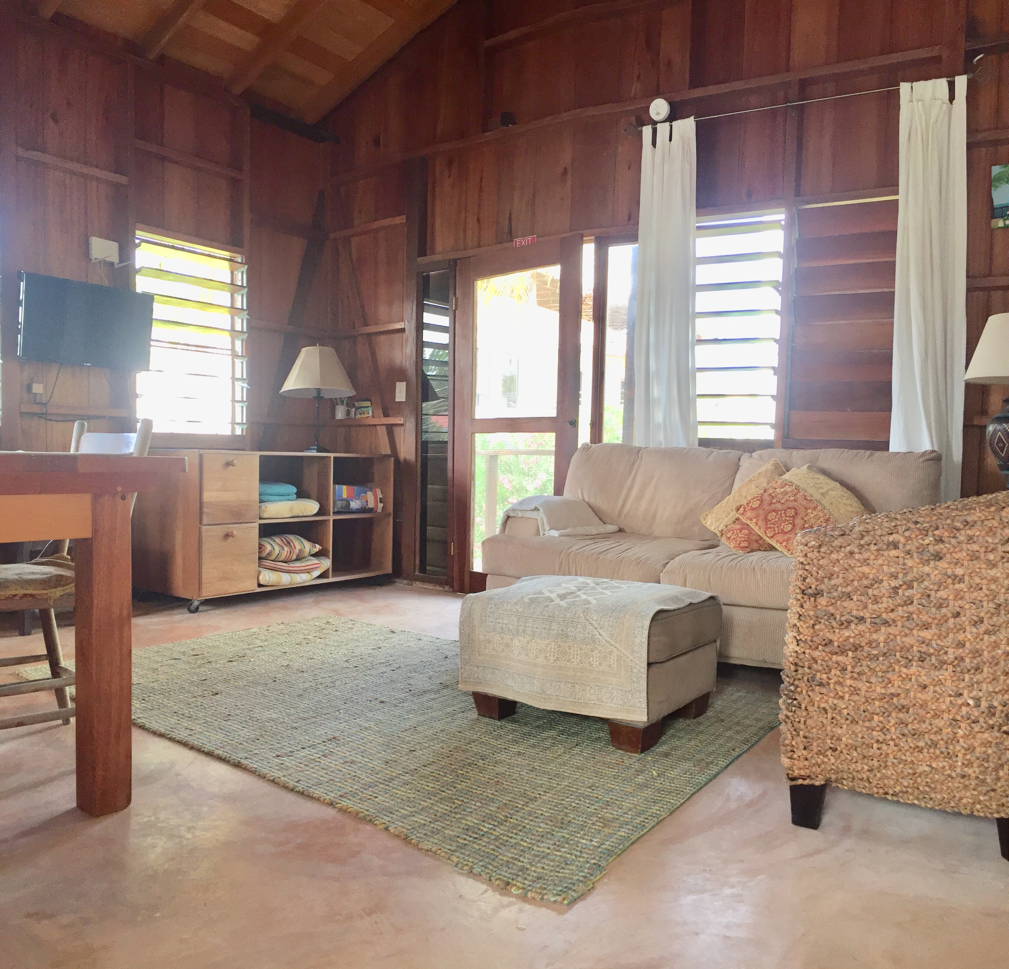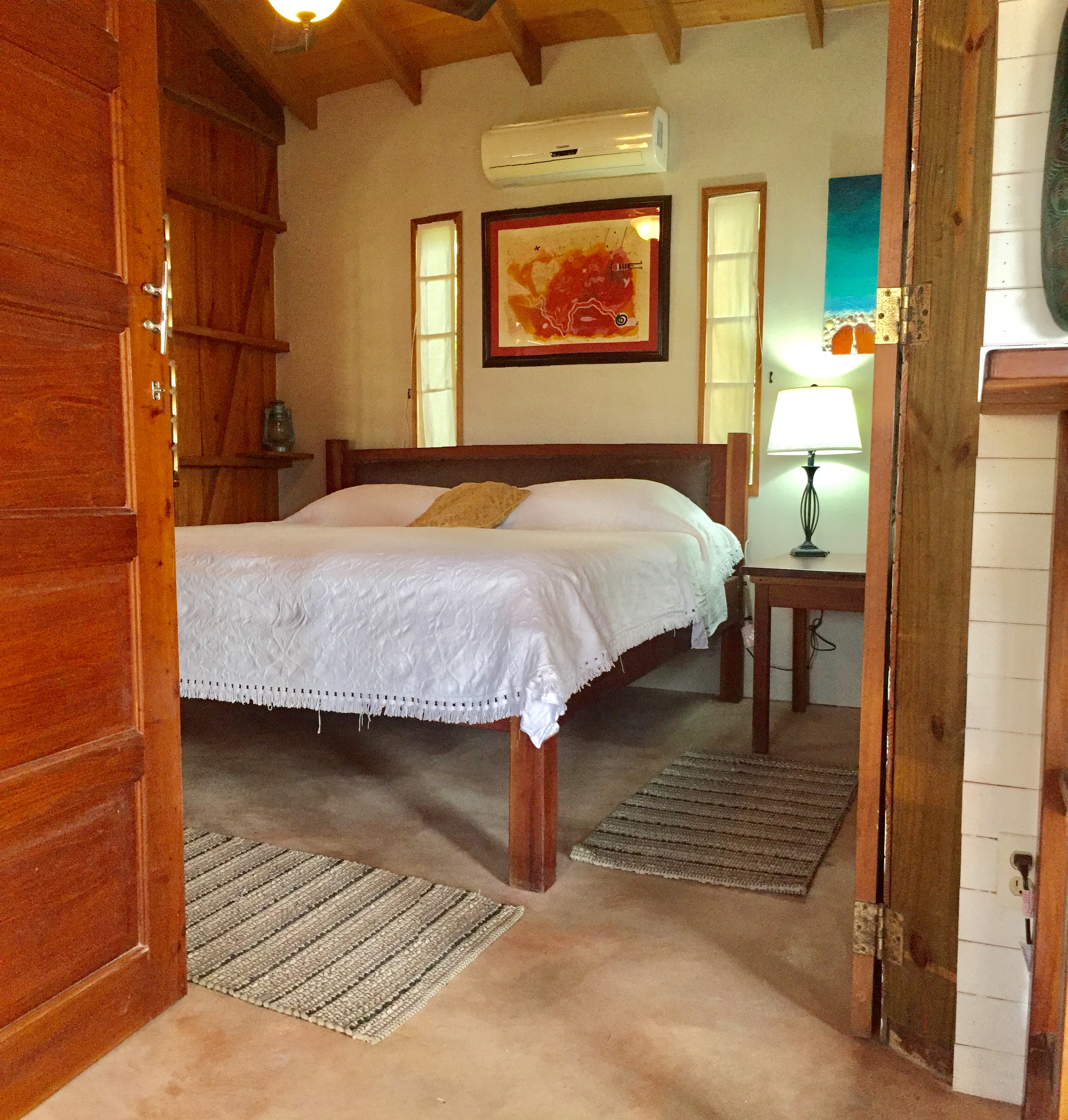 It is a small house, built high up. The main house is on the second floor, with the large all-in-one spacious living and dining and kitchen area. There are large double doors that open up to the bedroom and off that is the ensuite bathroom. There is AC in the bedroom only so you can close it off if needed or leave them open for the breeze and air if not. The bathroom has hot and cold running water, and a spacious walk in shower. There is Internet and local Cable TV which has 70 US TV channels including sports and news. There are balconies on three sides with chairs and hammocks everywhere. Inside-outside living is the way here!